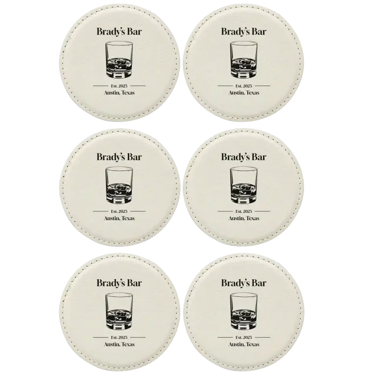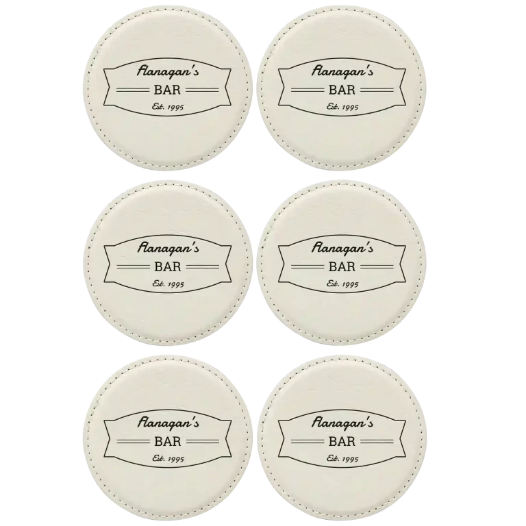 Personalized Bar EST Round Leatherette Coasters Set of 6 – White