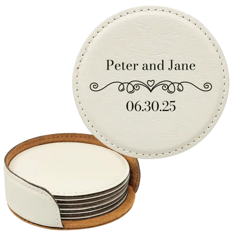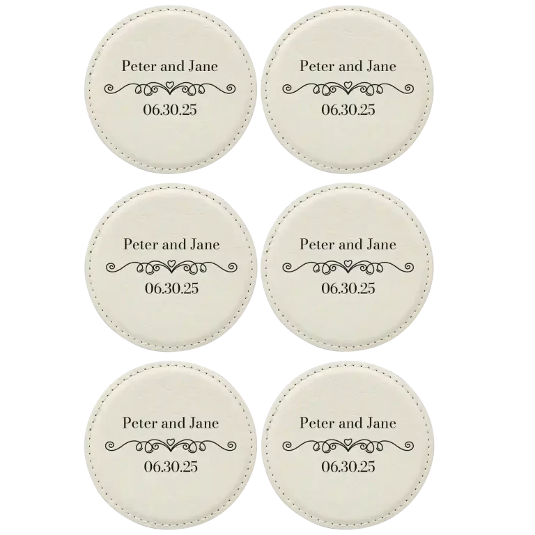 Personalized Couple Wedding Date Round Leatherette Coasters Set of 6 – White