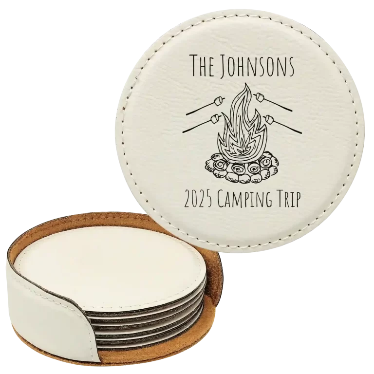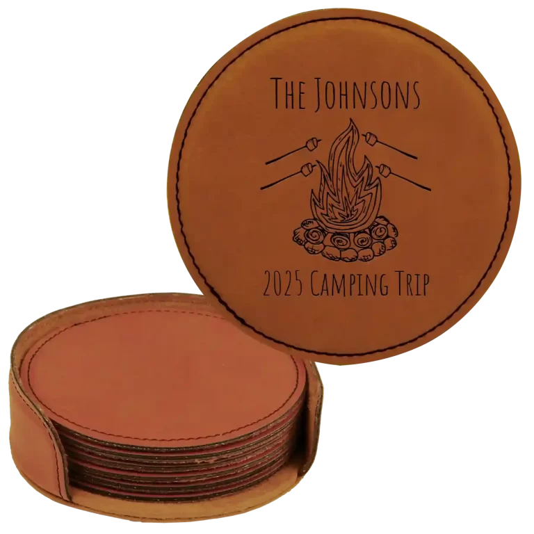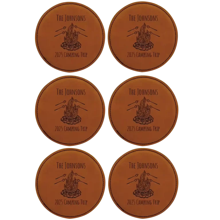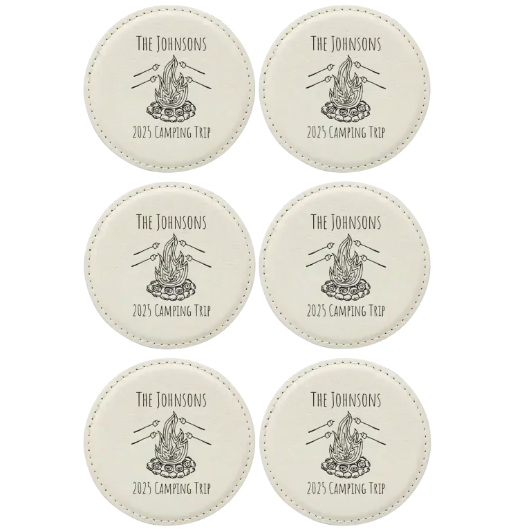 Personalized Camping Trip Round Leatherette Coasters Set of 6 – Rawhide