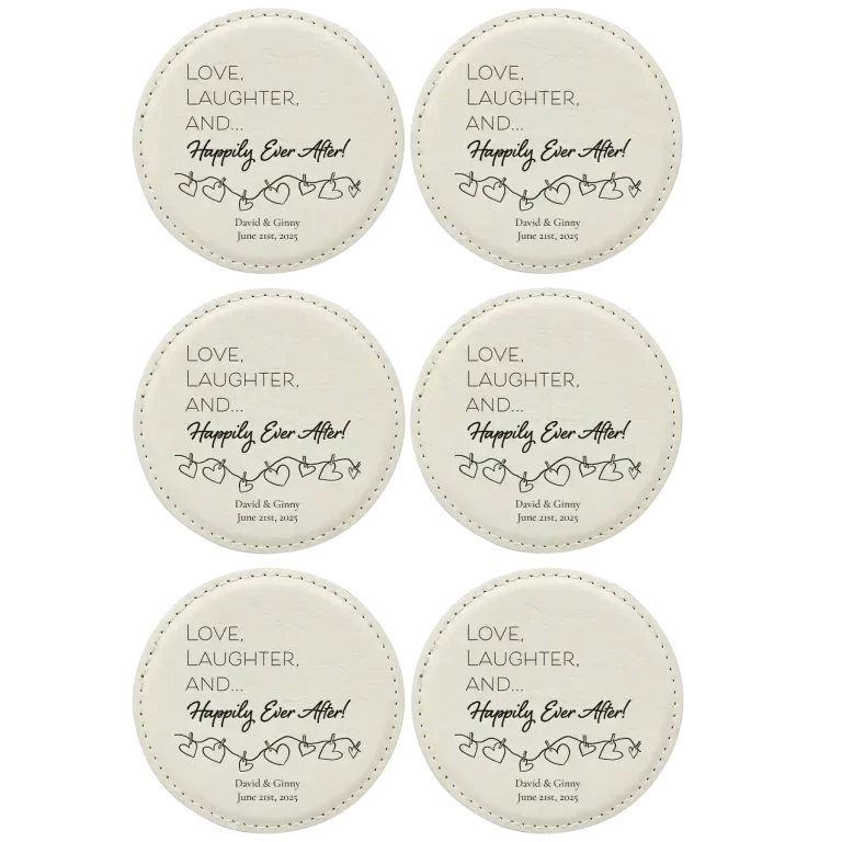 Personalized Happily Ever After Round Leatherette Coasters Set of 6 – White