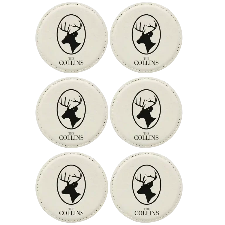 Personalized Deer Family Name Round Leatherette Coasters Set of 6 – White