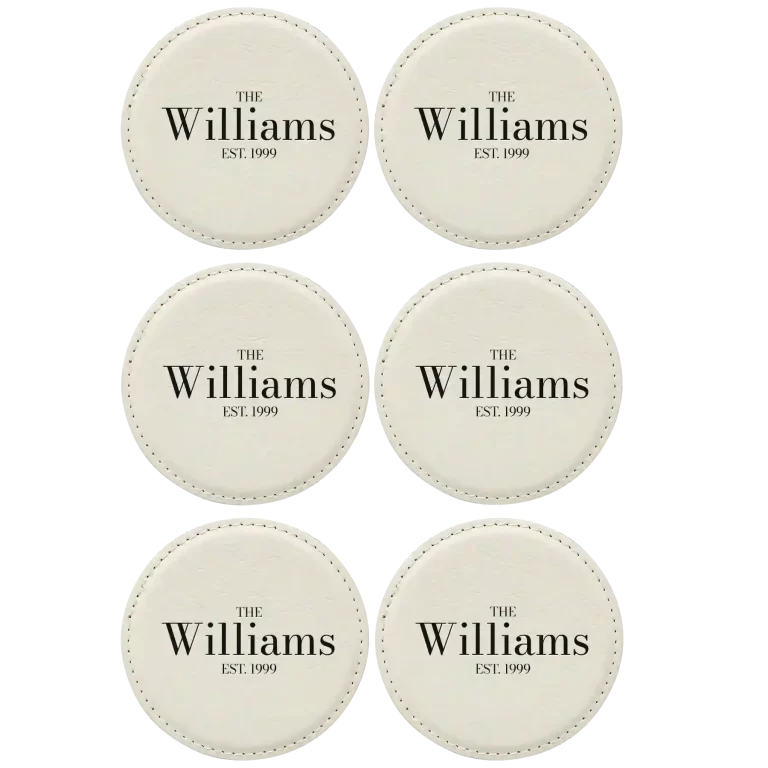 Personalized Family EST Round Leatherette Coasters Set of 6 – White