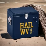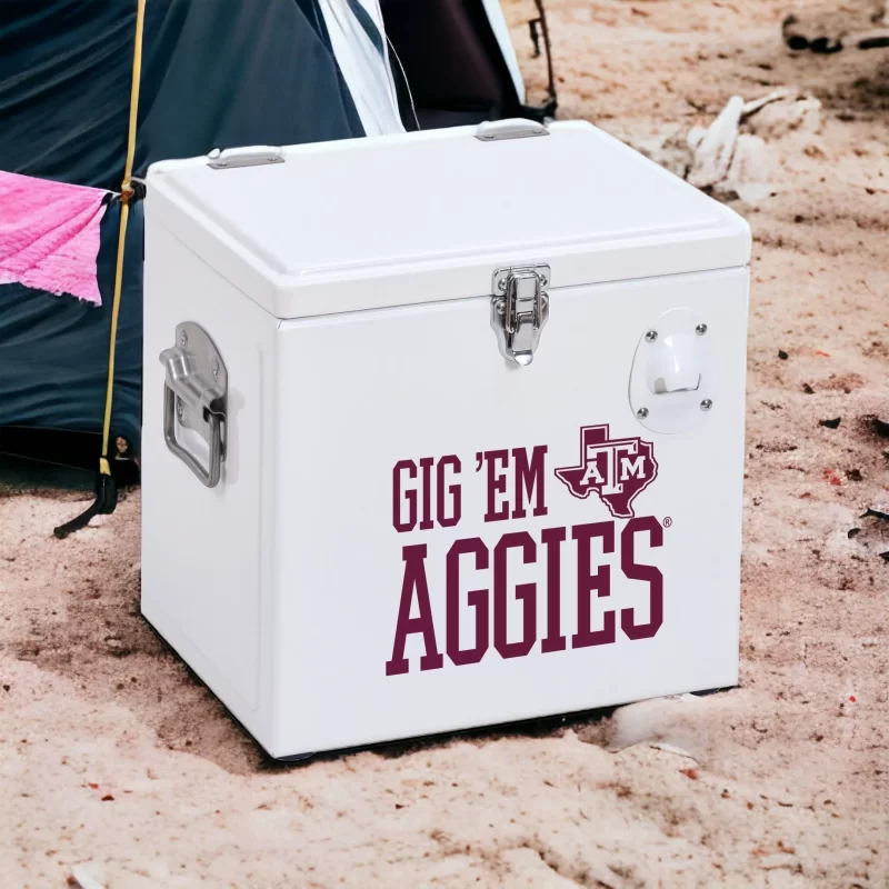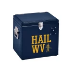 Metal party cooler with bottle opener and metal handles. Colorful finish. Keeps beverages and food cold for days. Holds up to 24 cans.