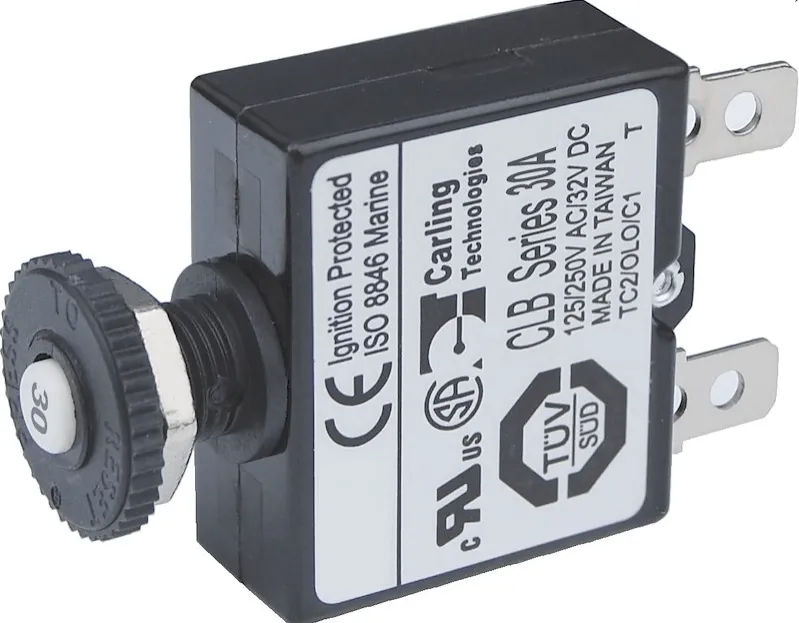 Circuit Breaker; 30 Amp/ 32 Volt DC; Thermal Type; 1/4 Inch Male Quick Connect Terminal; Push Button Manual Reset; Single; 3/8-27 UNS Panel Mount