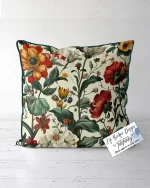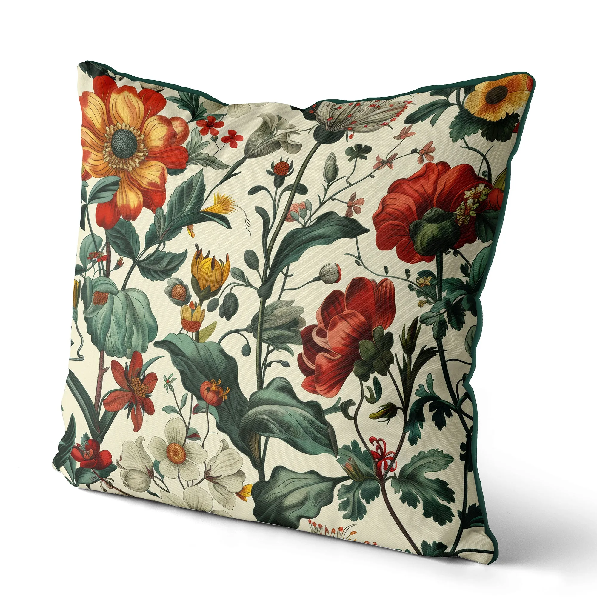 This elegant cushion features a timeless botanical design with richly detailed flowers and foliage in deep reds, golden yellows, and soft creams against a sophisticated neutral background. The intricate illustration evokes a vintage aesthetic, making it a perfect accent piece for classic and contemporary interiors alike. Framed with bottle green piping, it adds a refined, nature-inspired charm to any setting.