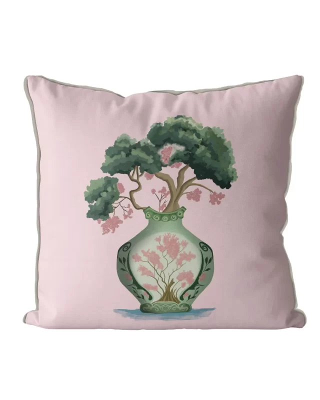 Beautiful pink and green chinoiserie cushion featuring a contemporary and slightly abstract chinoiserie vase taken from a painting by Kelly,