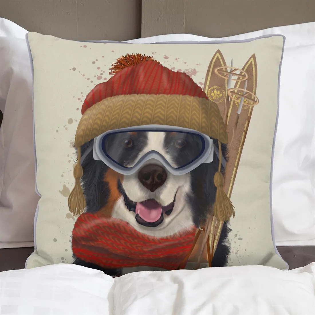 Bernese mountain dog ready for a day out on his skis. If you can bear to part with him, this accent pillow is the perfect dog lover gift or housewarming gift.