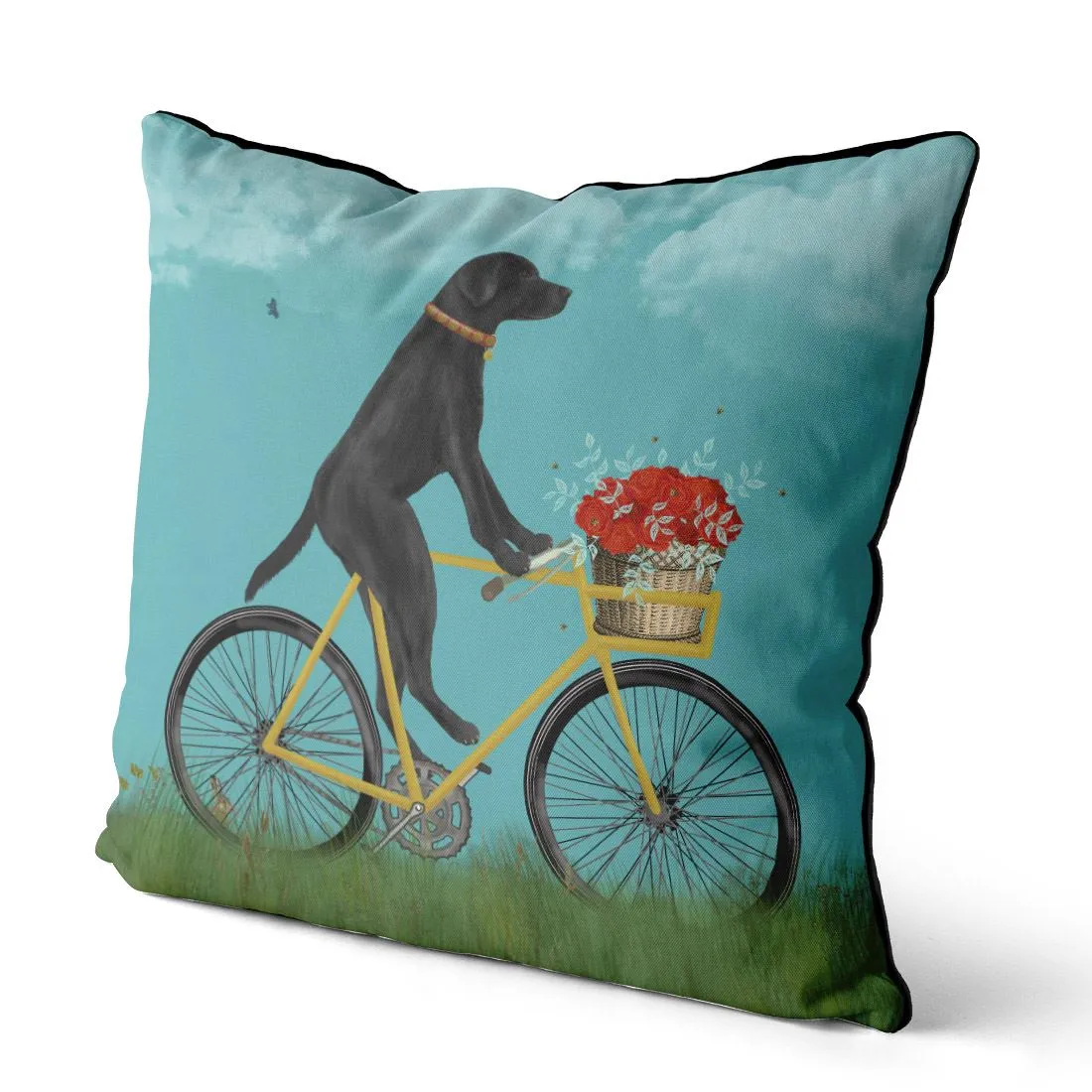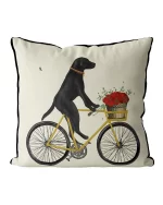 Fabulous Black Labrador pillow with a cute Bdog on a bicycle, with a basket of flowers. If you can bear to part with him, this accent pillow is the perfect dog lover gift, housewarming gift, or a great gift for a cyclist.