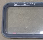 NOTES: Good used shape! Seals in good shape. Light tint. This window is the type that gets “sandwiched” between the outer frame and inner frame, being screwed on from the inside. Inner frame included. All hardware shown is included. See images.