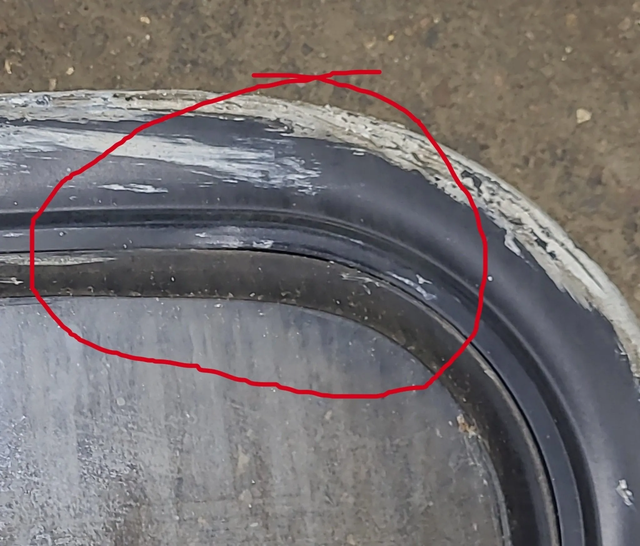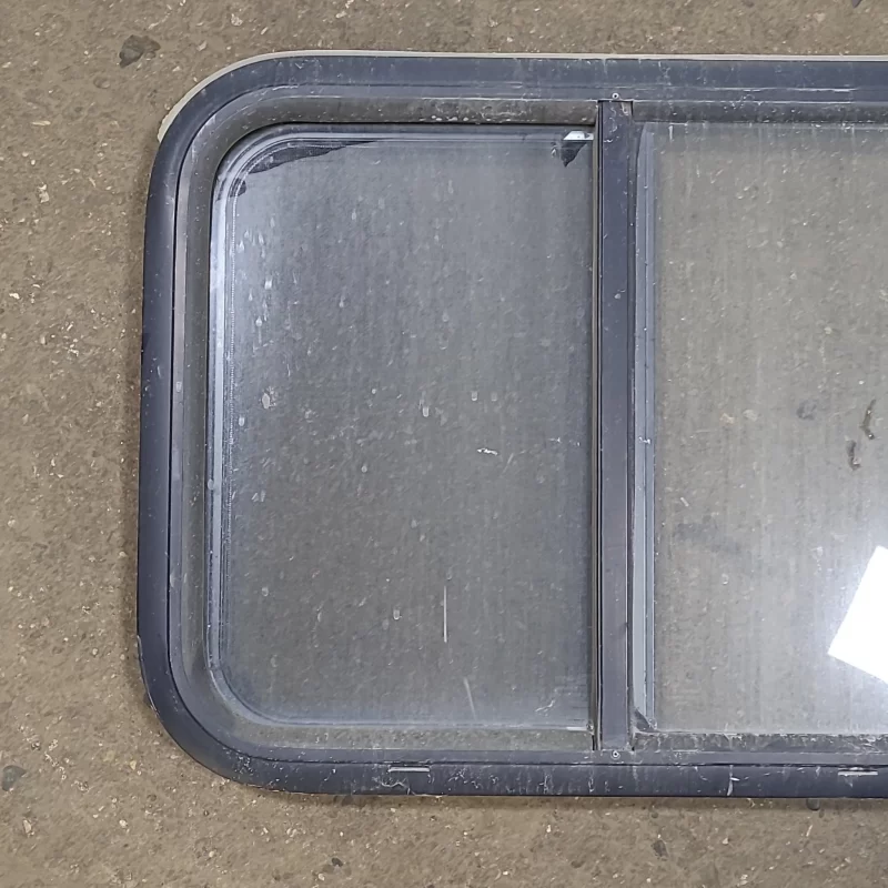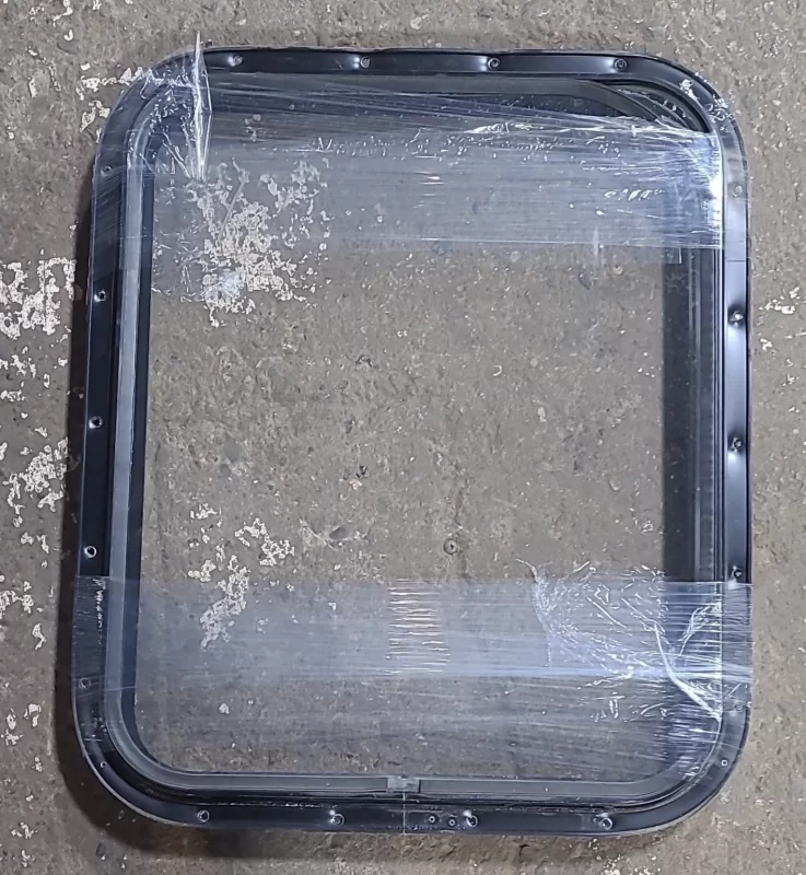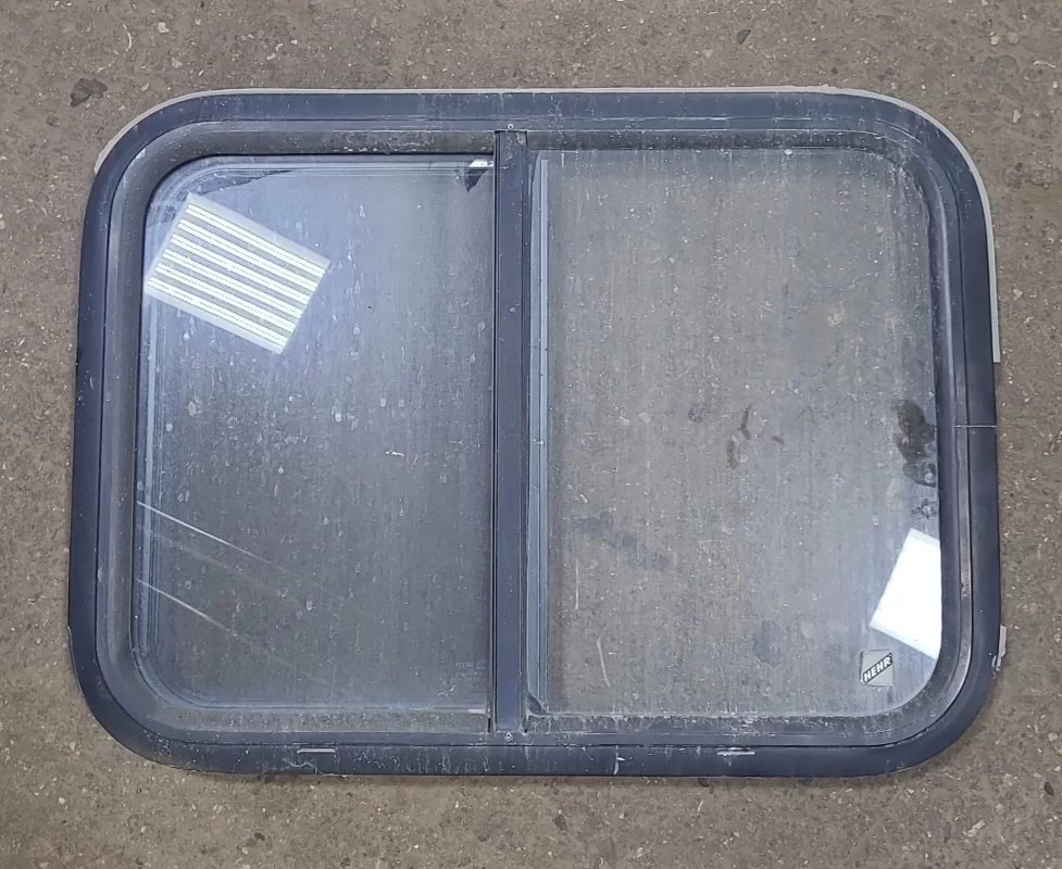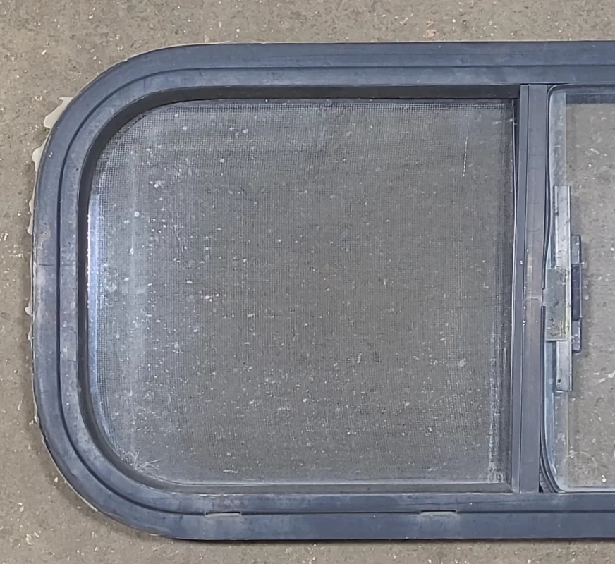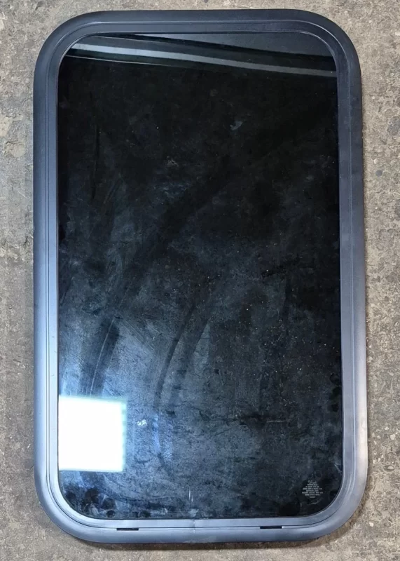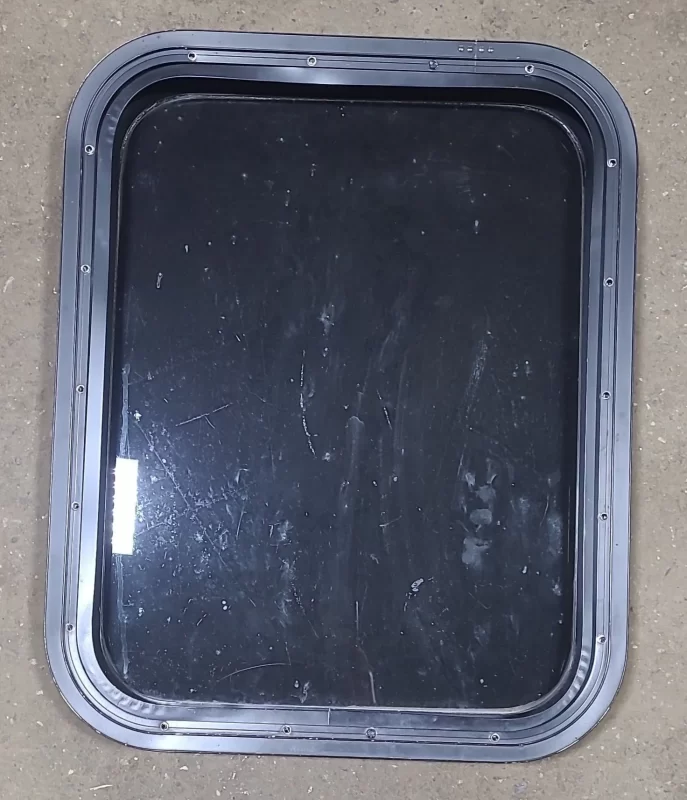 NOTES: Great used shape! Seals in good shape, 1 corner is starting to pull slightly. Lightly tinted. This window is the type that gets “sandwiched” between the outer frame and inner frame, being screwed on from the inside. Inner frame included. All hardware shown is included. See images.