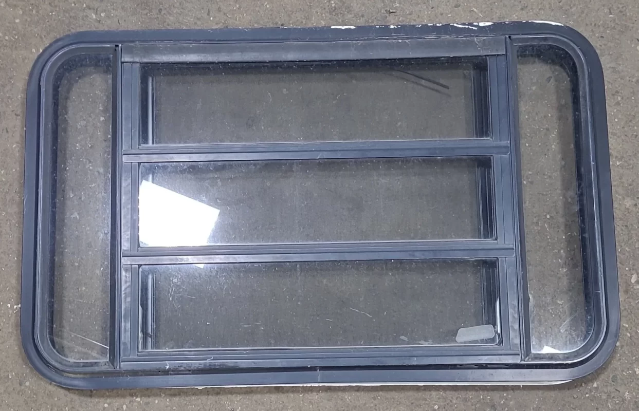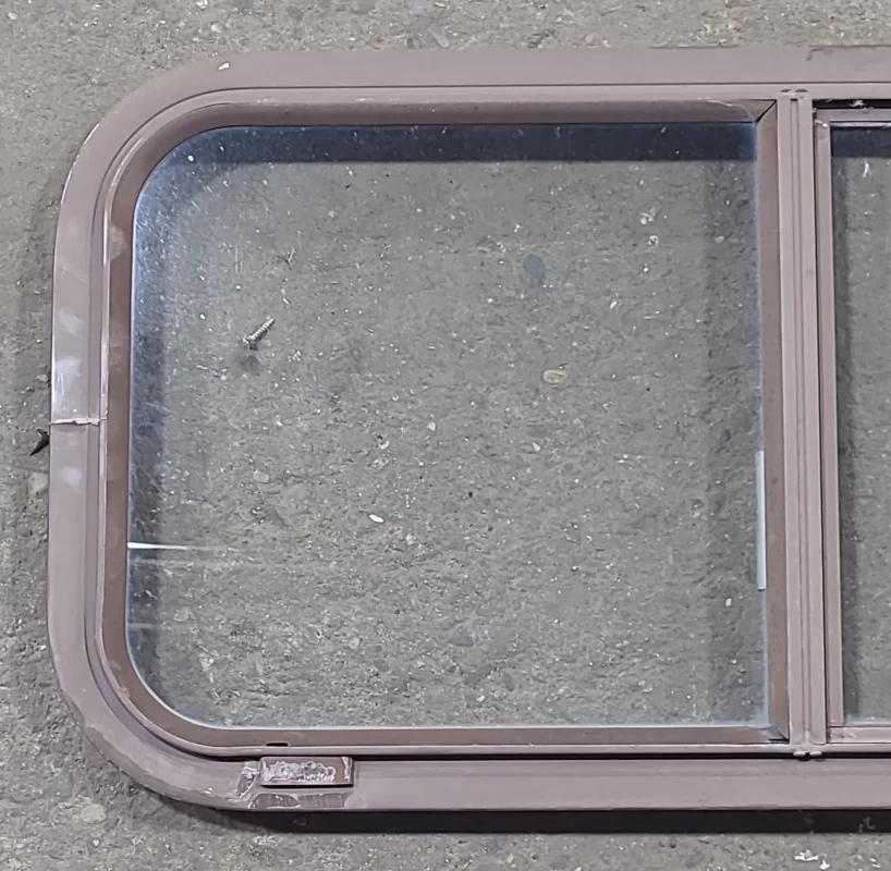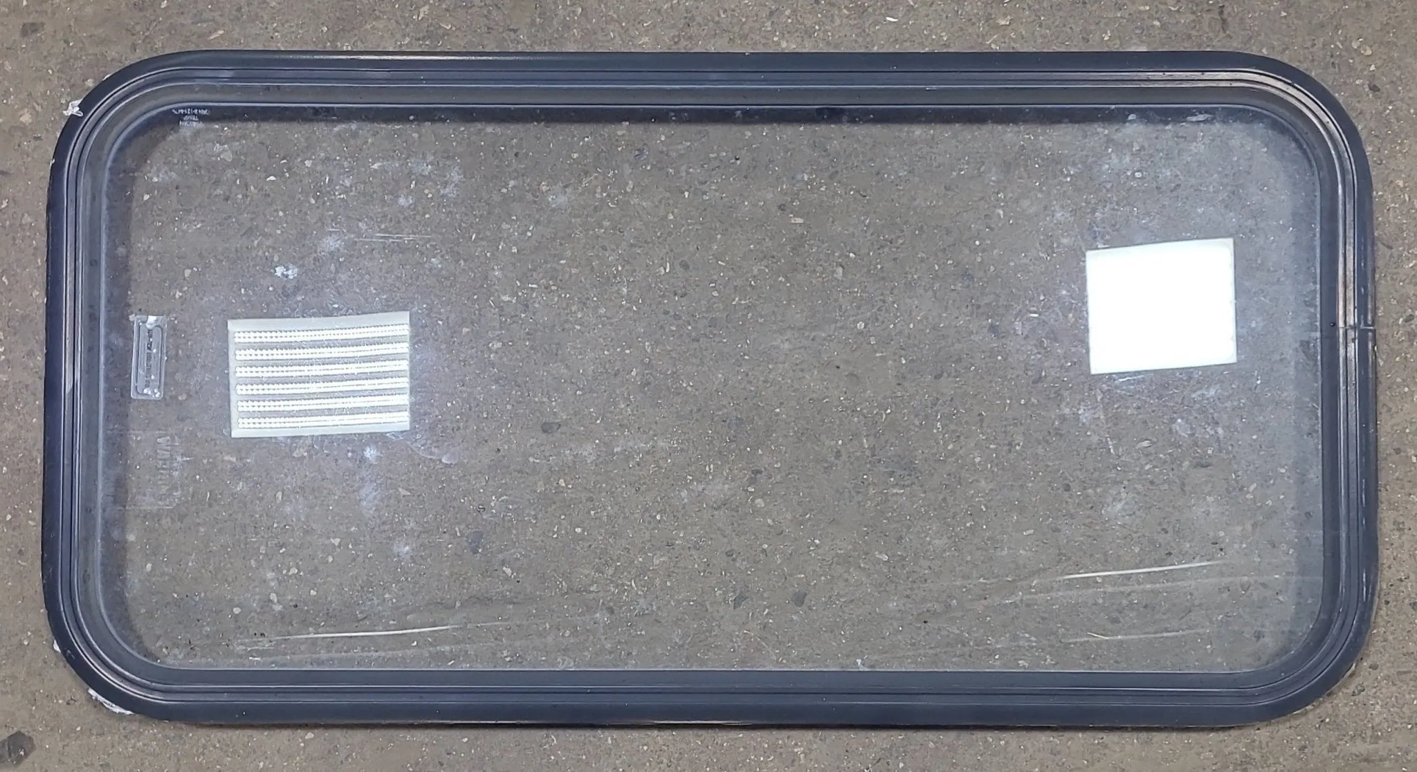 NOTES: Great used shape! Seals in good shape. Lightly tinted. This window is the type that gets “sandwiched” between the outer frame and inner frame, being screwed on from the inside. Inner frame included. All hardware shown is included. See images.