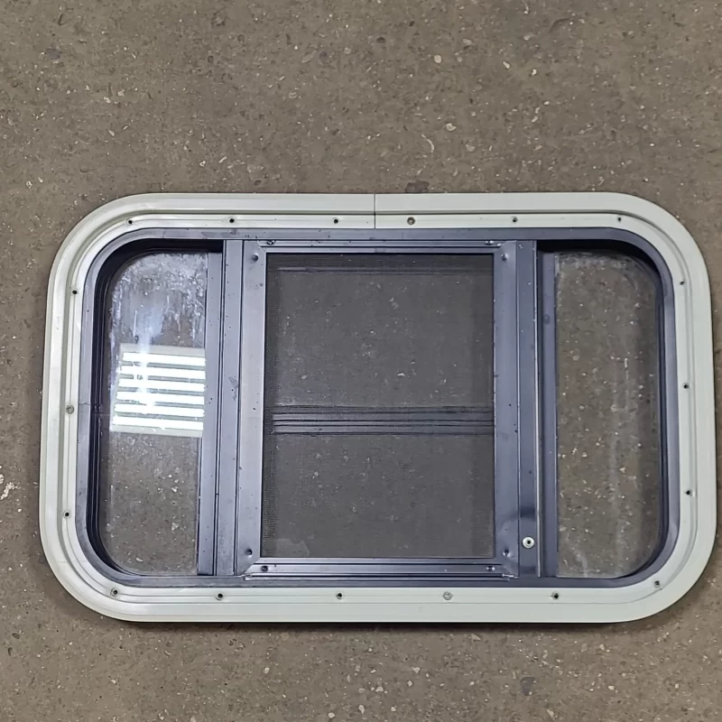 NOTES: Good used shape! This window is the type that gets “sandwiched” between the outer frame and inner frame, being screwed on from the outside. Screen is in good condition. Seals in good shape. Tinted. Inner frame included, has a couple bends from being taken out- should straighten up easily. See images.