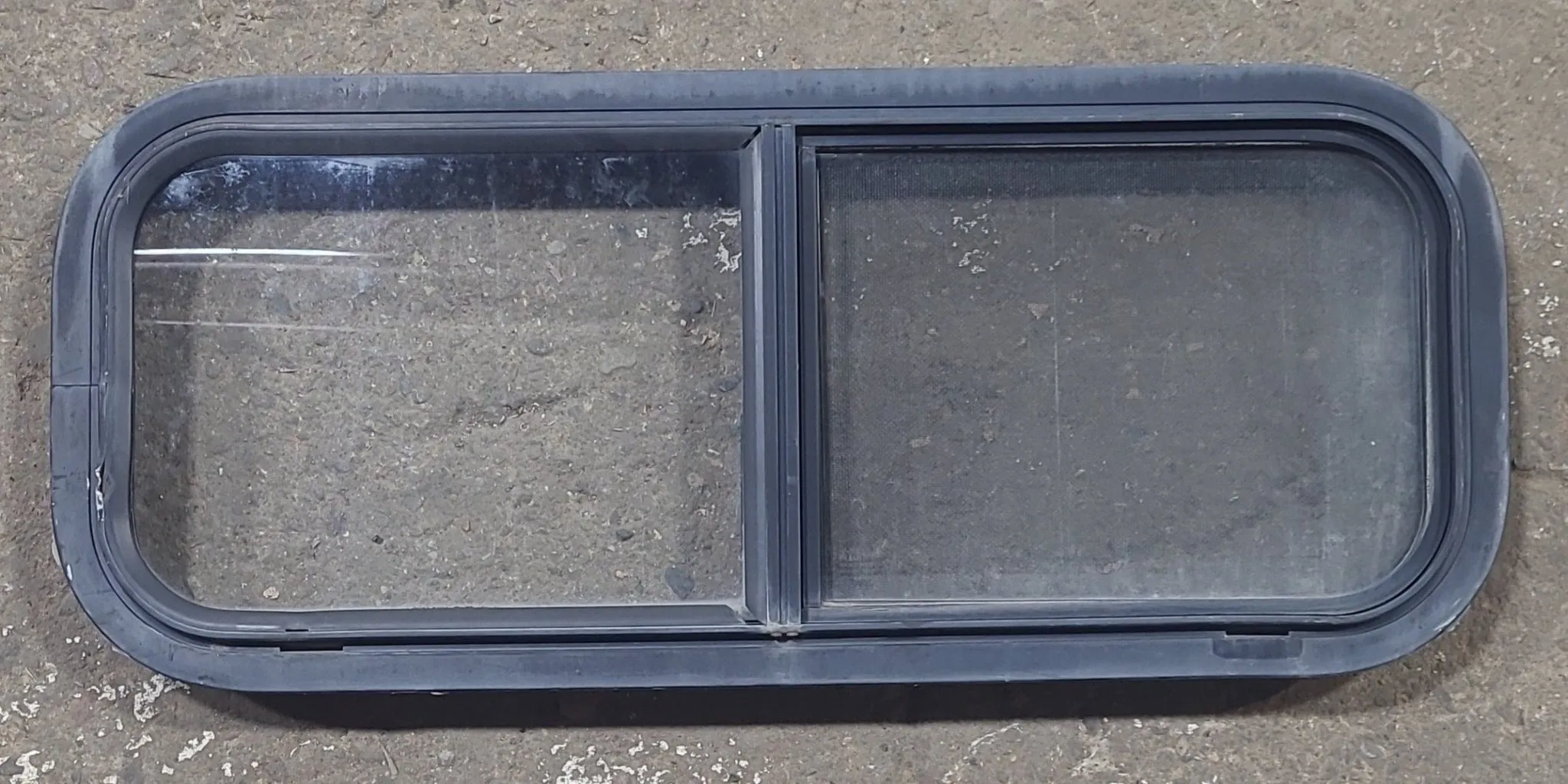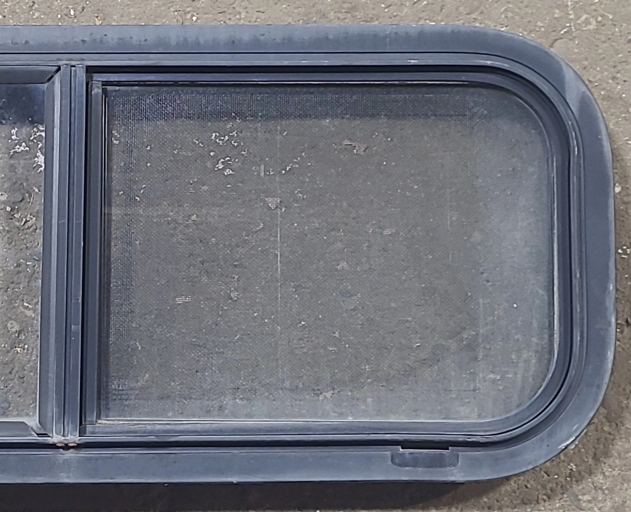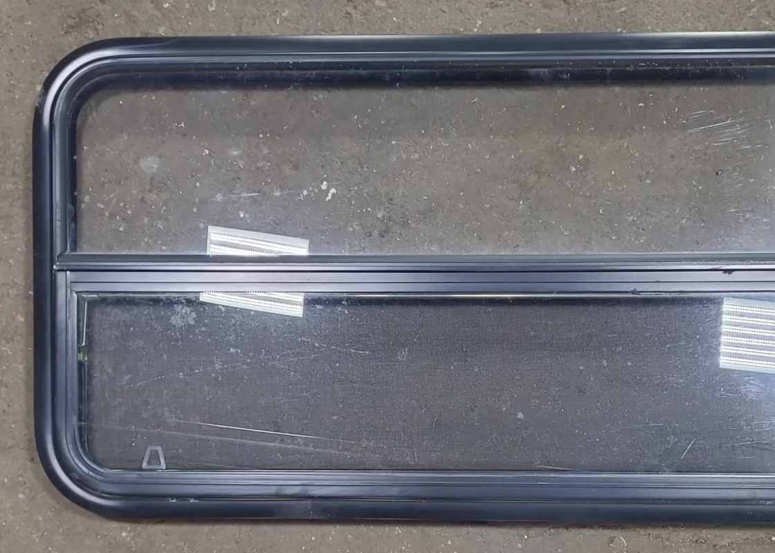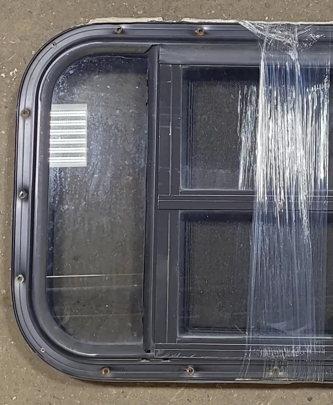 NOTES: Good used shape! This window is the type that gets “sandwiched” between the outer frame and inner frame, being screwed on from the inside. Screen is included, and is in good shape. Seals in good shape. Minor damage to outer frame (as shown in images) price reflected. Lightly tinted. Inner frame included. See images.