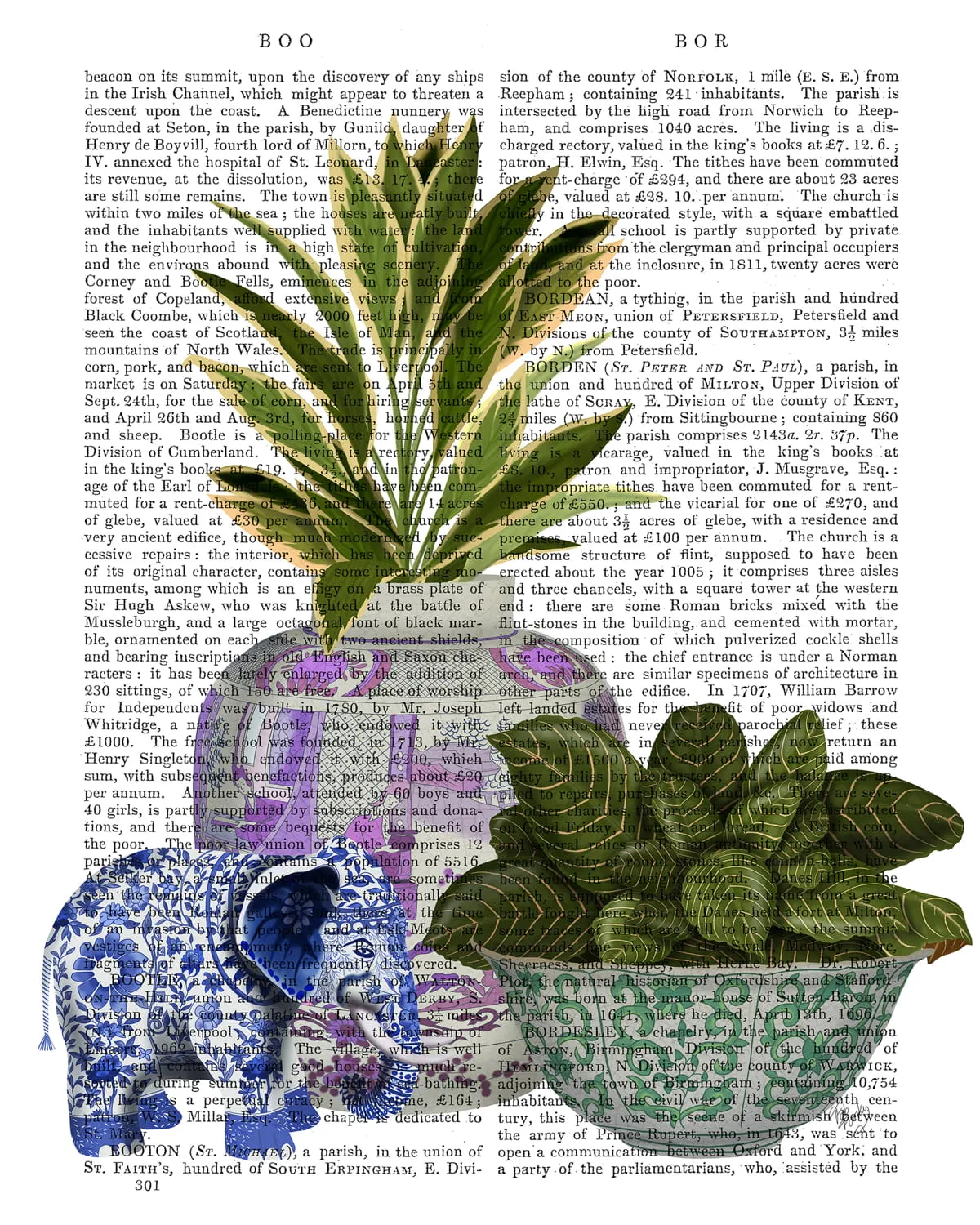 A beautiful chinoiserie illustratiion of a collection of oriental planted bowls and urns with a decorative blue & white elephant
