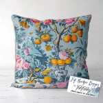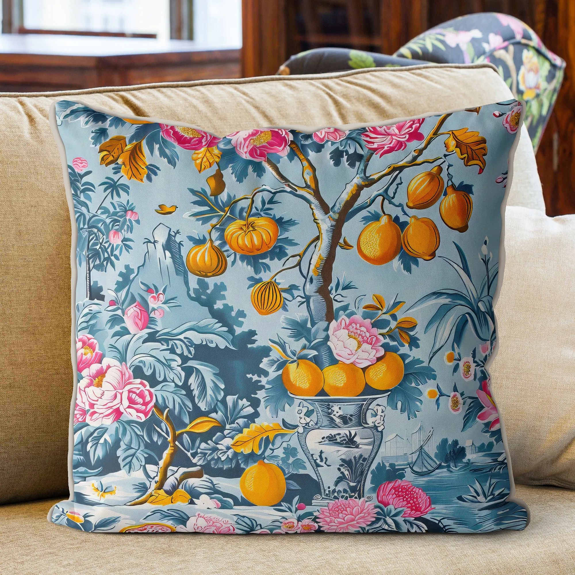 This enchanting design features a flourishing fruit tree laden with golden citrus, nestled among lush foliage and vivid pink blooms, all set against a serene soft blue background.