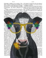 Lovely black and white farm cow in some groovy yellow flower glasses