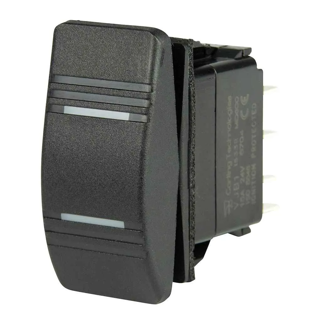 Double pole, double throw switch turns two of four circuits on at a time. Common applications combining nav lights and anchor light with independent bulbs, maintained single windshield wiper control. Contura switches are rated to IP66, high-pressure wash resistant. Recommended for replacements in waterproof electrical panels with rocker switches to ensure waterproof integrity. The black and gray switches and covers are interchangeable with similar switches used as original equipment on many common boat types.