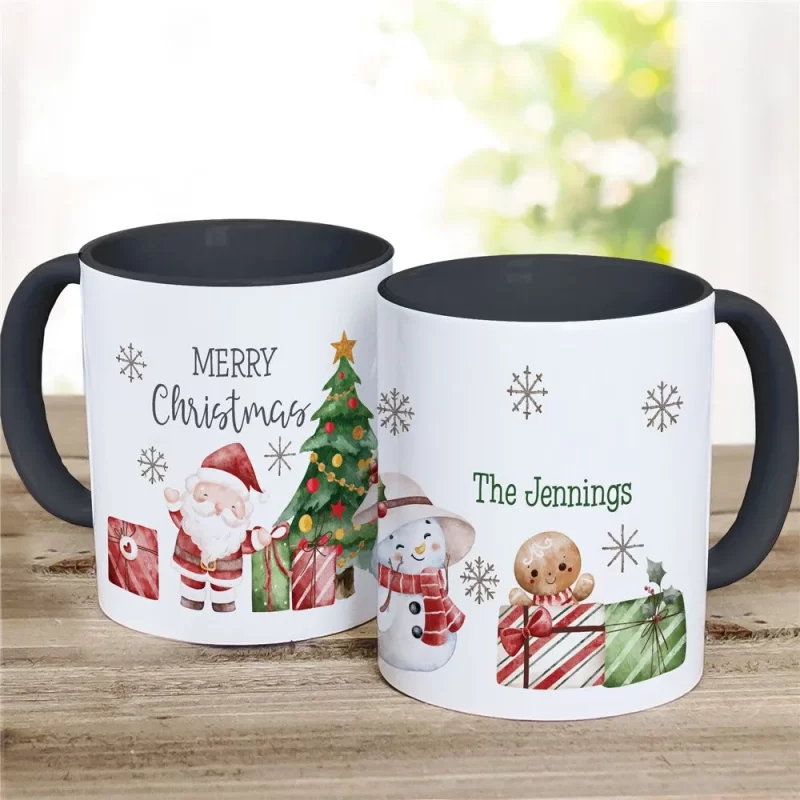Cute Watercolor Santa and Snowmen with Family Name Coffee Mug – Custom Christmas Mug