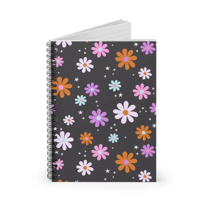 Channel your inner flower child with the Retro Starry Daisy Spiral Bound Journal. Featuring a groovy pattern of colorful daisies and whimsical stars against a sleek dark background, this design is perfect for anyone who loves retro vibes with a modern twist.