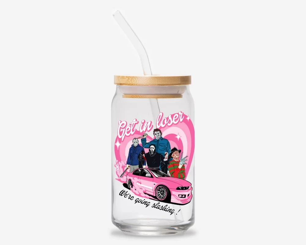 Get In Loser, “We’re Going Slashing” Horror Slasher Glass Can Tumbler