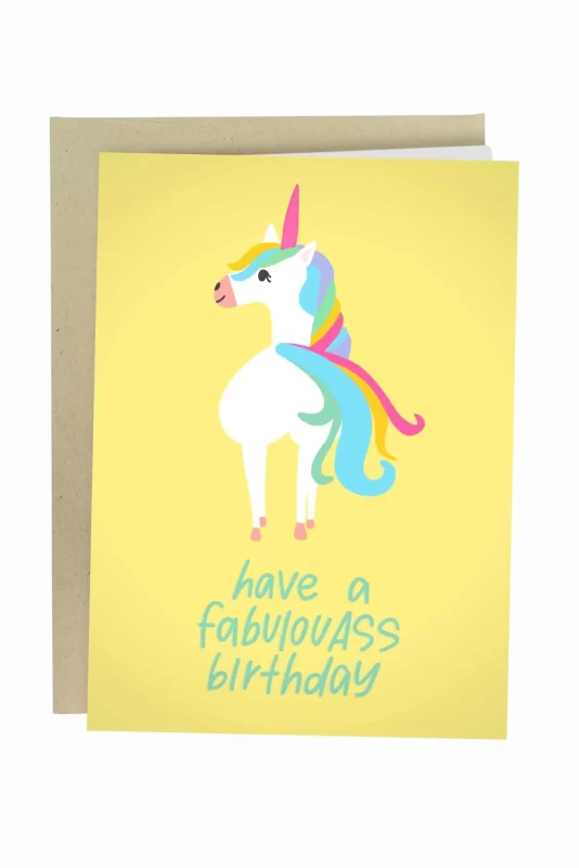 Fabulous but make it sassy… FabulouASS. The front of this funny birthday card features an illustration of a unicorn. Made