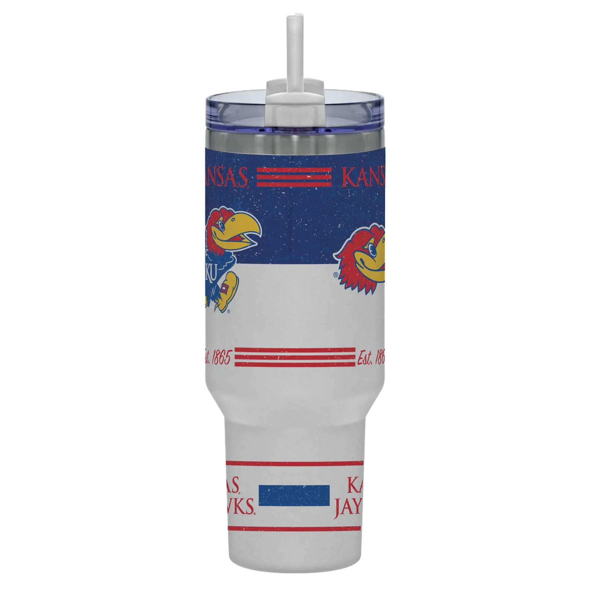 With this incredible tumbler, proudly show off your love for the Kansas Jayhawks. It features a full wrap of graphics from top to bottom, a sizable handle, a lid perfect for sipping or straws, and double wall vacuum insulation to keep your favorite drinks hot or cold for hours on end! Plus, it even comes with a straw included in the box!