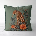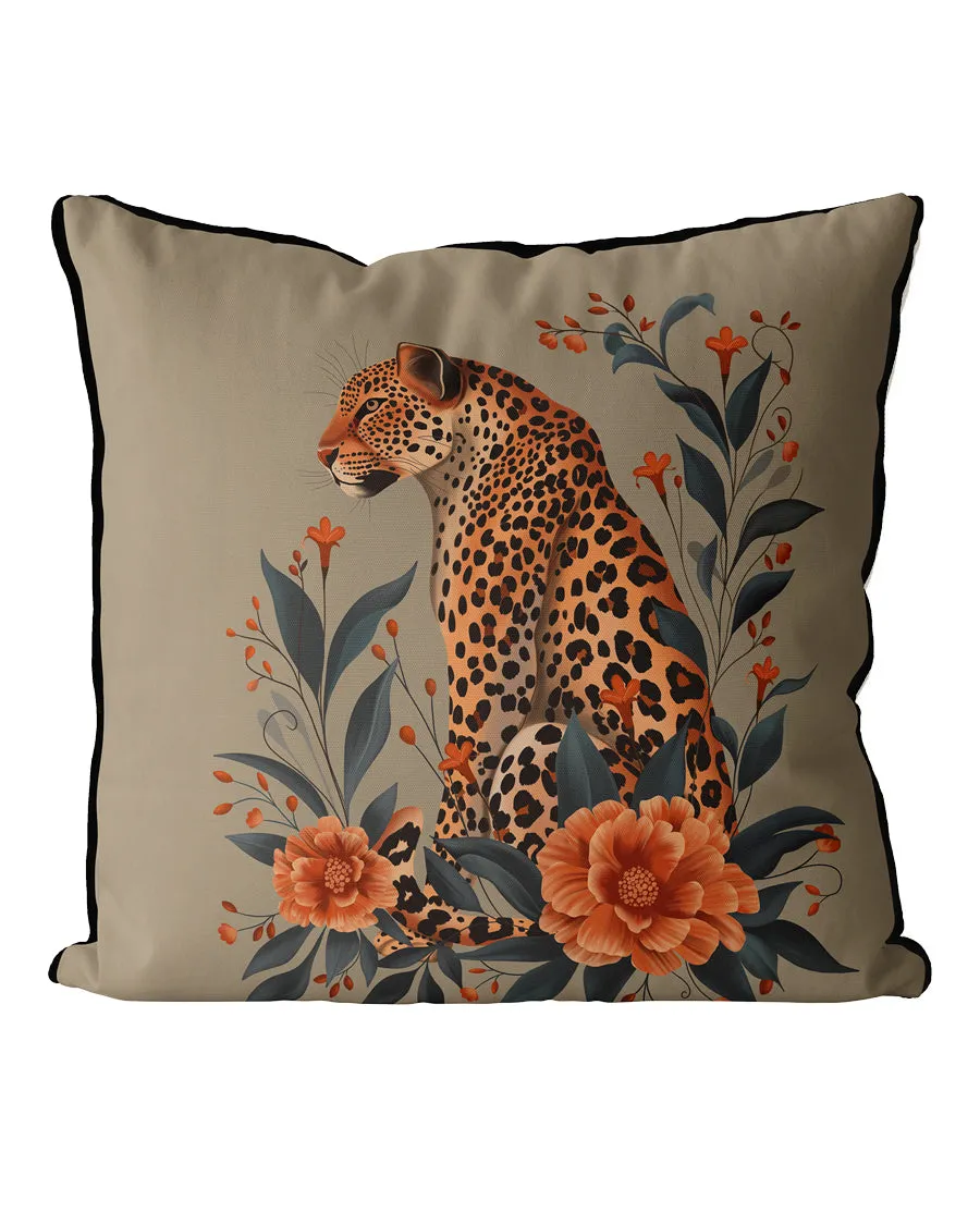 Brighten your space with this exquisite cushion featuring a majestic leopard surrounded by lush floral elements. The rich, earthy tones and detailed artwork create a sophisticated and modern look, perfect for any room. Available in green or taupe. A matching partner cushion with a leopard facing the opposite direction is also available in our shop as seen in the last images.
