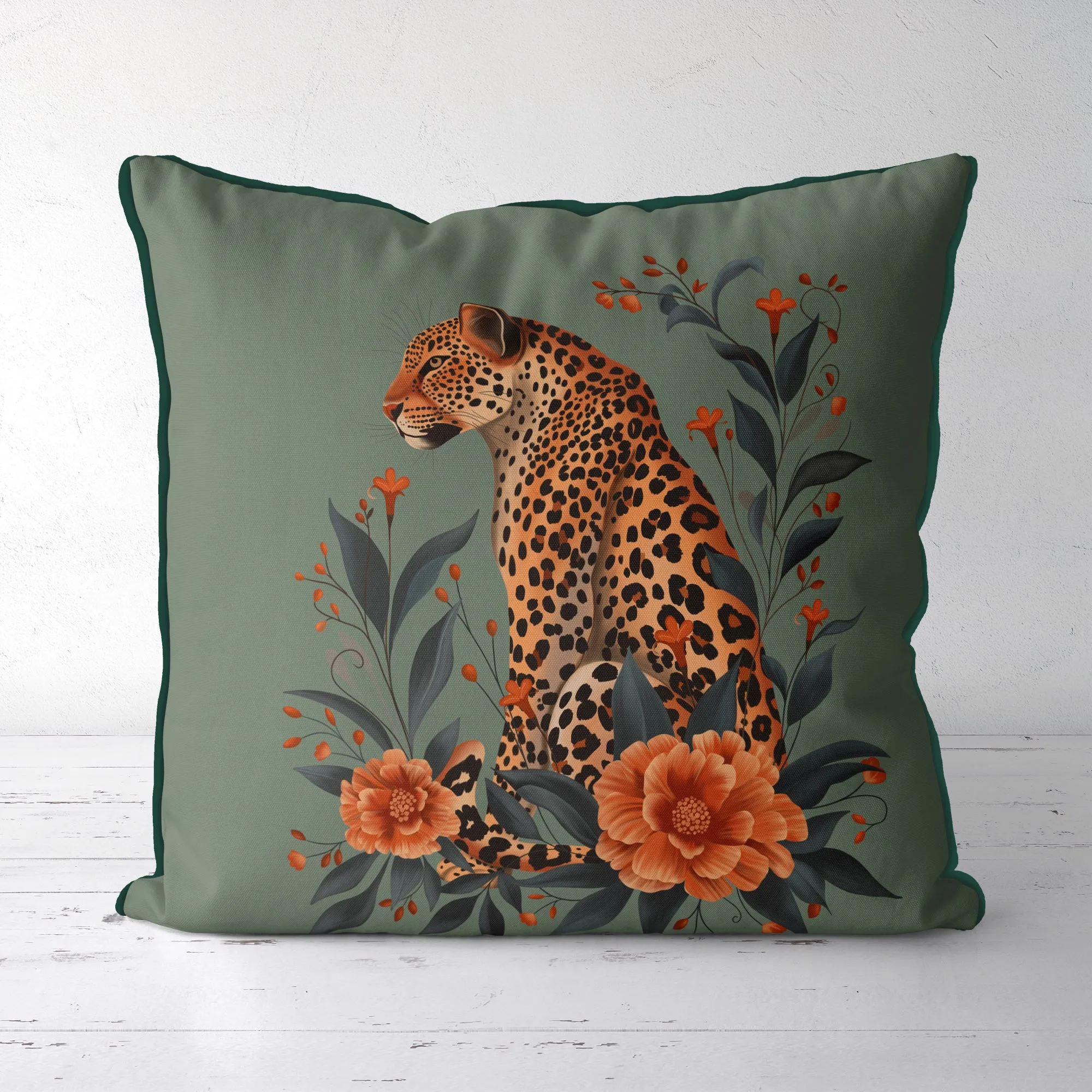Leopard Orange Flowers 2 Cushion, Throw Pillow in Green or Taupe