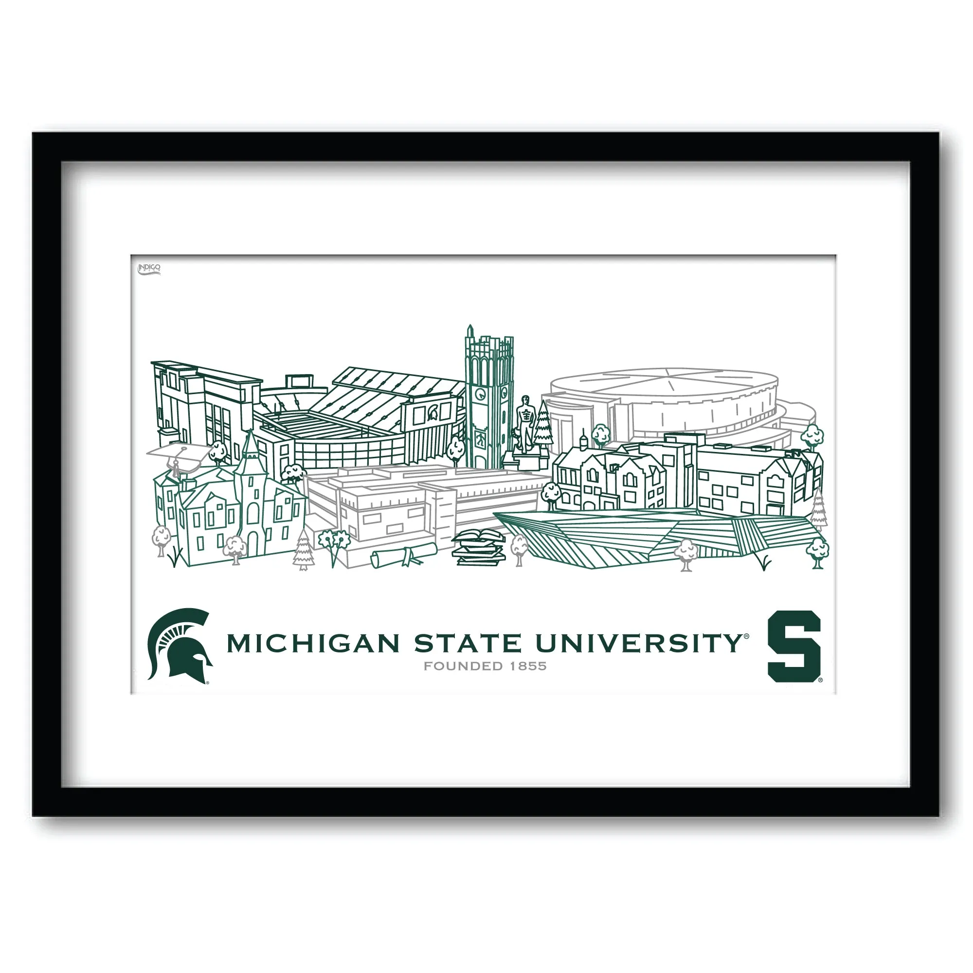 Turn your space into a Spartans paradise with this colorful campus wall piece, featuring Josh Seubert’s line art. Show off the sleek, modern design of famous university buildings in your home or workplace. This copyrighted campus line art print is a must-have for all Michigan State fans! Professionally mounted in a stylish 11″x14″ black frame.