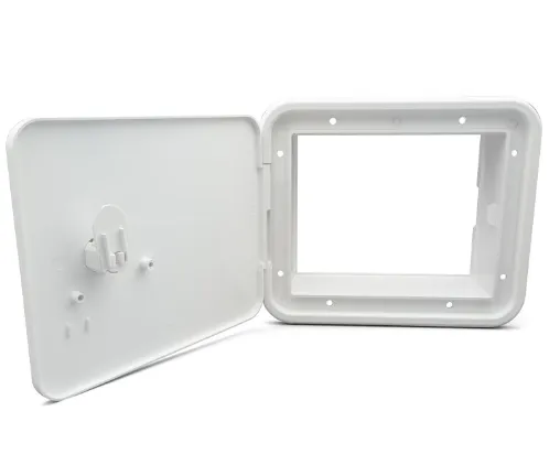 Electrical Cord Hatch; Storage Hatch; 4-3/4 Inch Height x 5-7/8 Inch Width Cutout Dimension; 6-1/2 Inch Height x 7-5/8 Inch Width x 1-1/8 Inch Collar Depth; Without Back; Polar White; Key Lock; UV And Impact Resistant; With Installation Kit; Without Back; B&B Cross Reference E8102-A