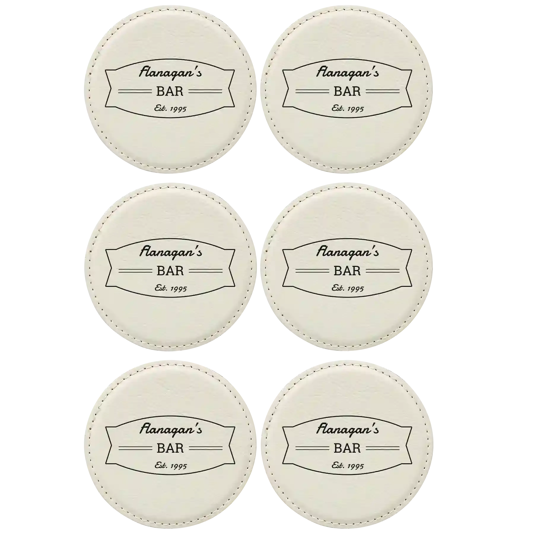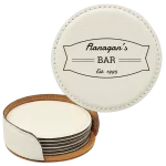 Home » Shop » Personalized Bar Banner Round Leatherette Coasters Set of 6 – White