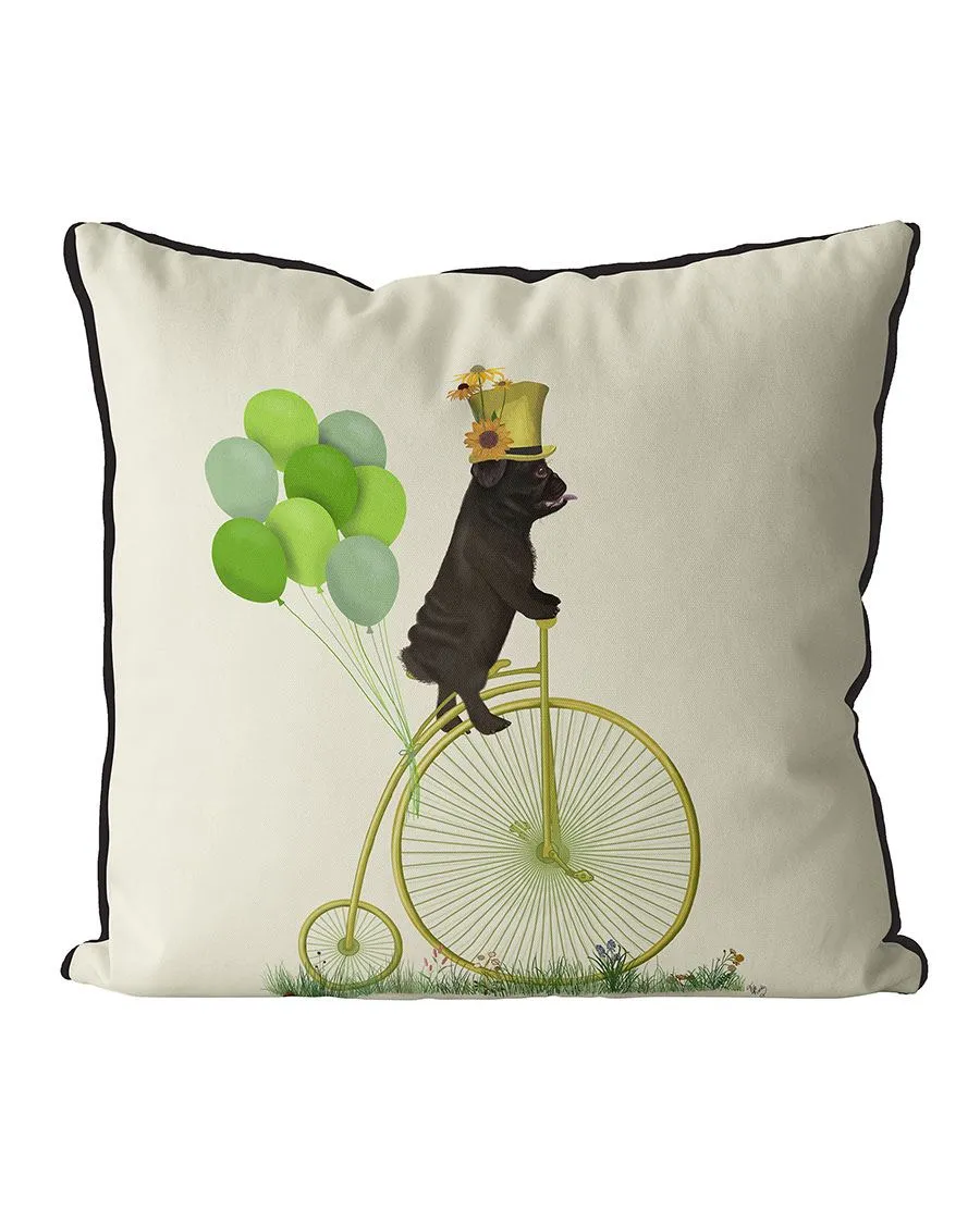 Pug Black on Penny Farthing, Cushion / Throw Pillow