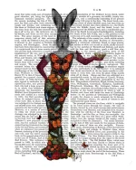 Rabbit in a multicolored butterfly dress drinking a cocktail