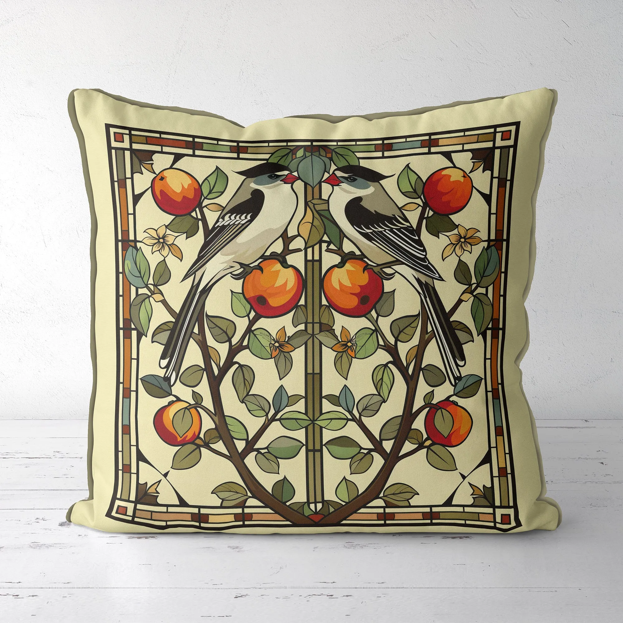 Bring timeless elegance to your space with the Rubinette cushion, featuring a stunning symmetrical design of birds perched among vibrant red and golden apples. Inspired by classic stained glass artistry, the intricate detailing and warm tones create a sophisticated yet inviting look. Perfect for adding a touch of nature-inspired charm to cottagecore, vintage, or modern interiors, Rubinette makes a beautiful statement piece for any room.
