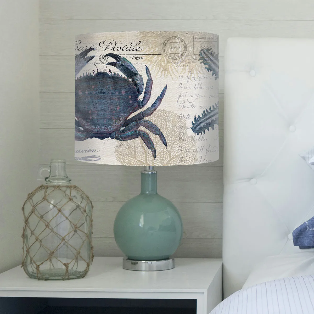 Create a coastal inspired space with our Seaside Postcard lampshade. Adorned with traditional nautical images, and featuring a lovely blue crab at the front, this lamp shade is additionally decorated with images of antique handwritten letters and postage stamps, evocative of letters and postcards written by the seaside.