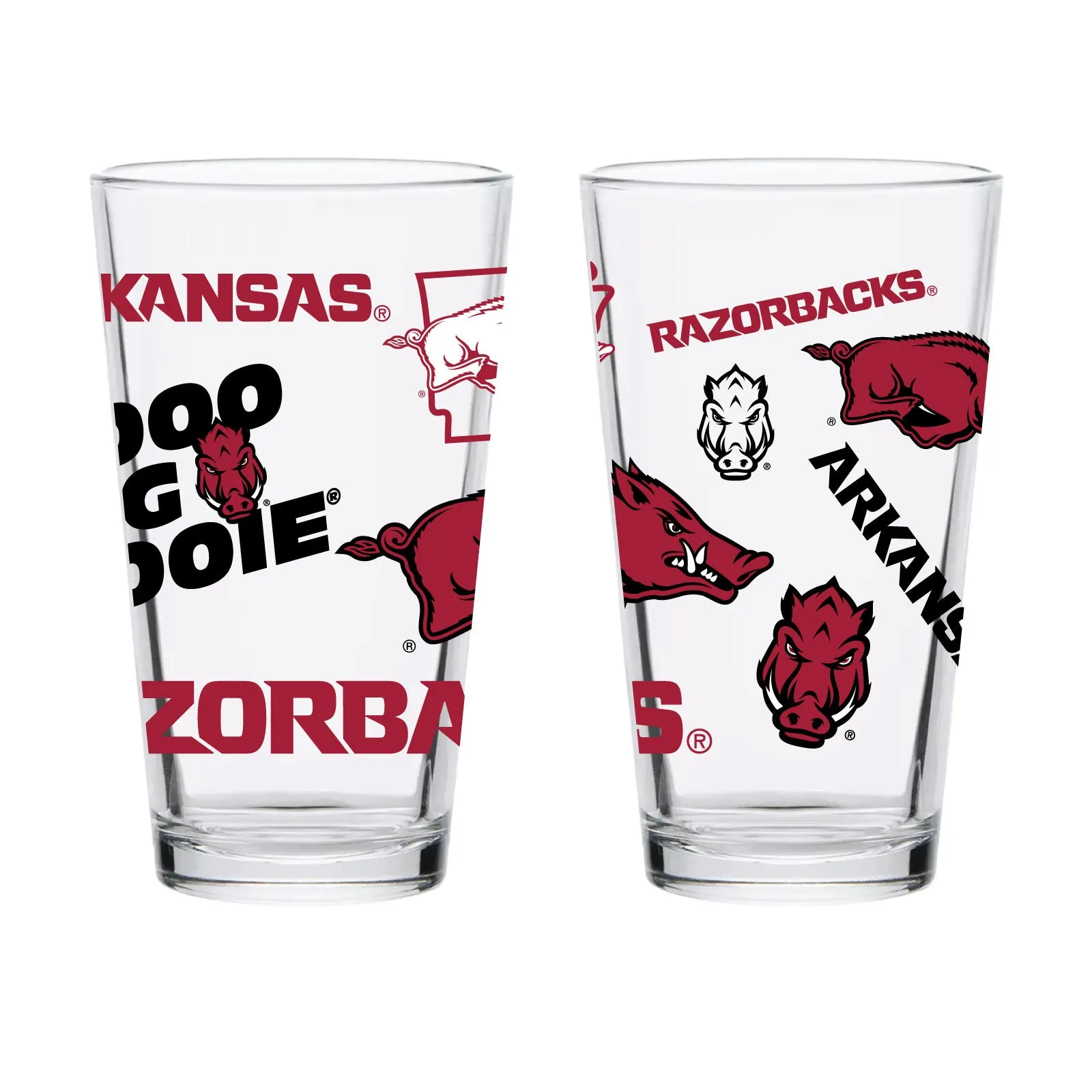Elevate your drinking experience with this exclusive set of 2 made in USA pint glasses. Show your fandom of the Arkansas Razorbacks with sophisticated style. The textured design features a variety of logos, each slightly raised for a luxurious touch. Enjoy any beverage in these clear glasses, perfect for any occasion.