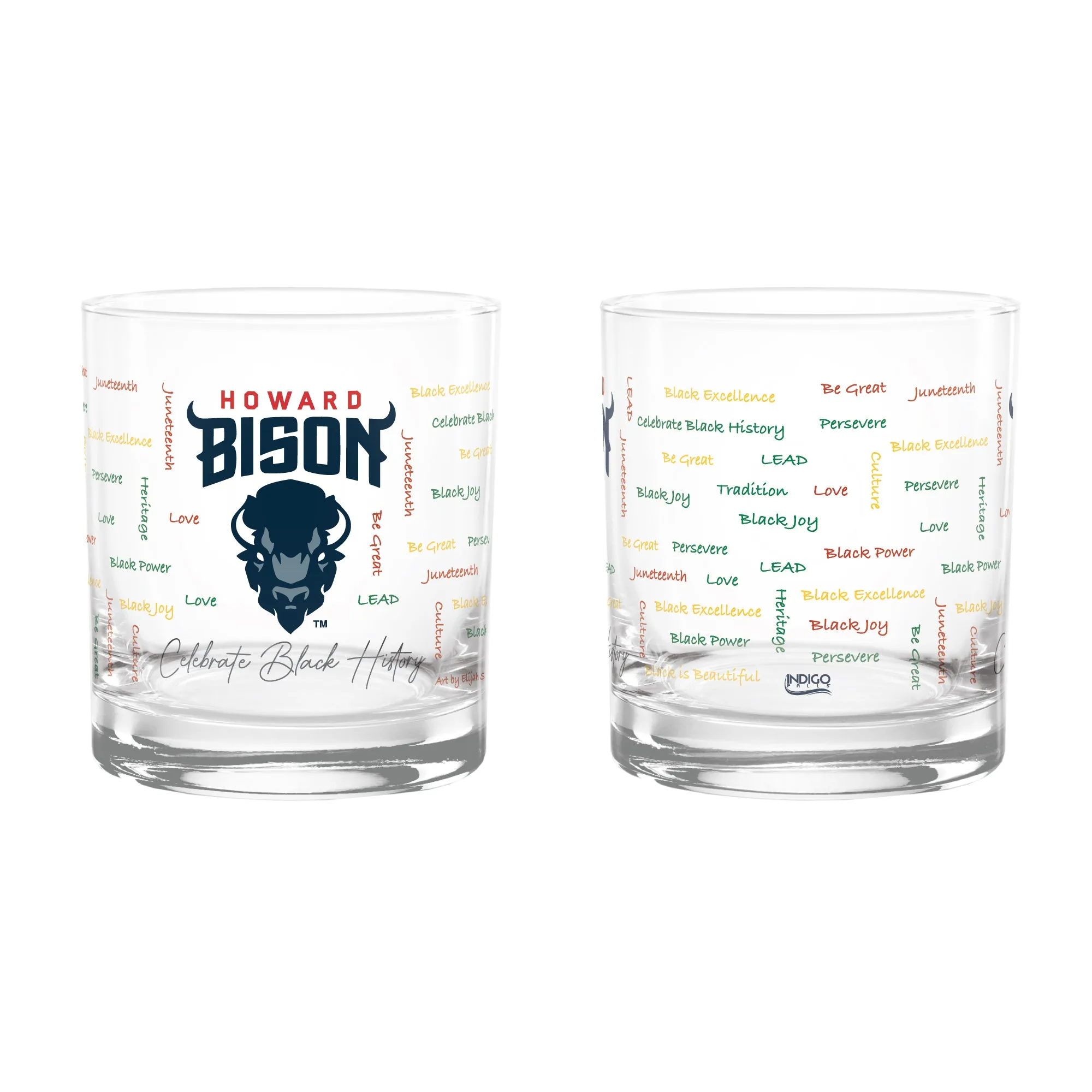Support Howard Bisons and honor Black History Month with our distinctive 14oz BHM Rocks Glasses. Each glass showcases artwork by Elijah Smith, a talented HBCU student, making them not only functional but also a wonderful expression of creativity. To keep them looking their best, we recommend hand washing.